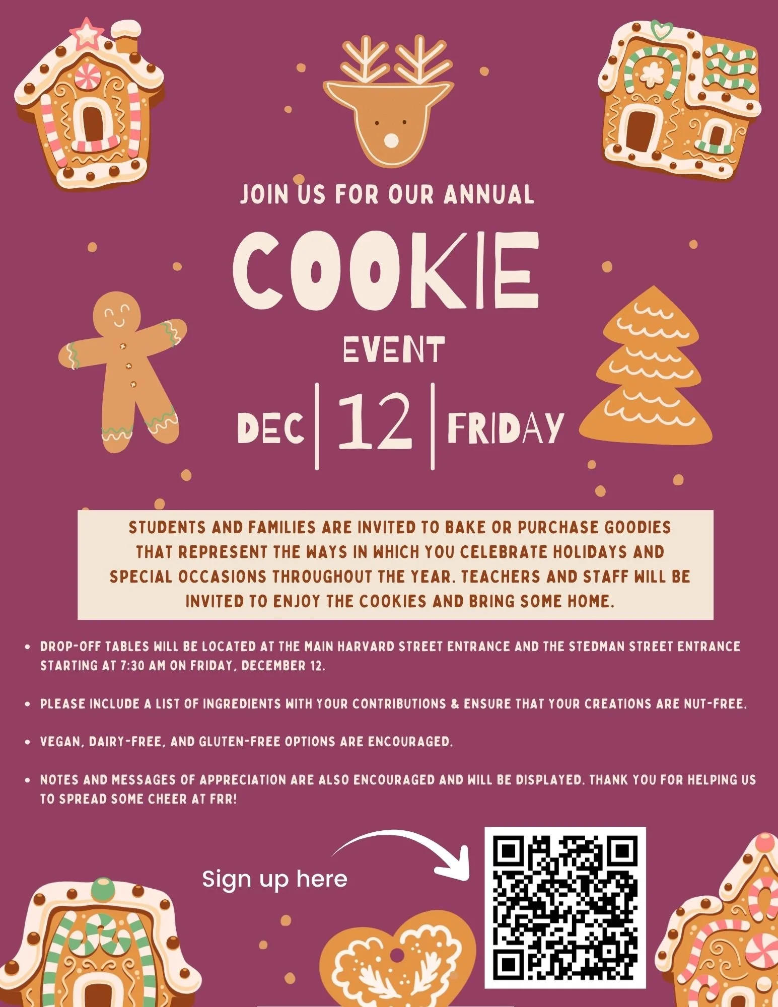 Students and families are invited to bake or purchase goodies that represent the ways in which you celebrate holidays and special occasions throughout the year. Teachers and staff will be invited to enjoy the cookies and bring some home. Notes and messages of appreciation are also encouraged and will be displayed. Thank you for helping us to spread some cheer at FRR!